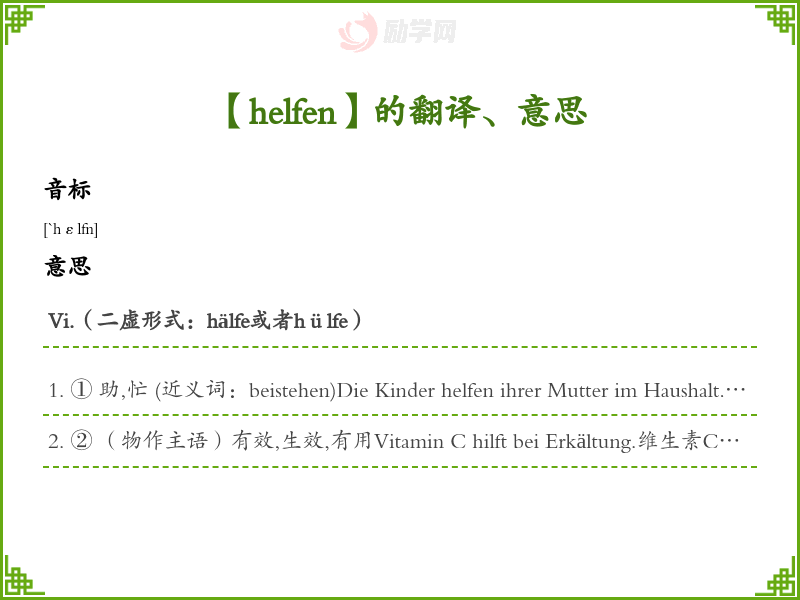 ① 助,忙 (近义词:beistehen)Die Kinder helfen ihrer Mutter im Haushalt.孩子们他们母亲做家务。Er half der alten Frau beim Einsteigen ins Auto. 他老太太上了汽车。Er hat ihr suchen / beim Suchen geholfen.他她找东西。