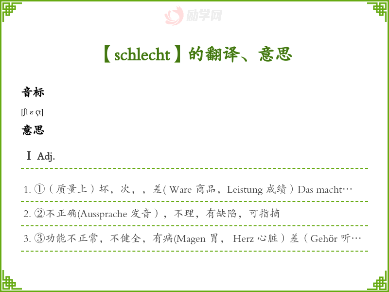 ⑥(后果)有害(Rat 建议),不利(Aussichten 前景),不详(Omen 征兆),令人不愉快(或不舒服)(Nachricht 消息,Stimmung 气氛, Kritik 批评, Geschmack 味道)Das wird eines Tages ein schlechtes Ende nehmen.这事儿早晚不有结果。Das war gar kein schlechter Gedanke.这个法一点儿不坏。