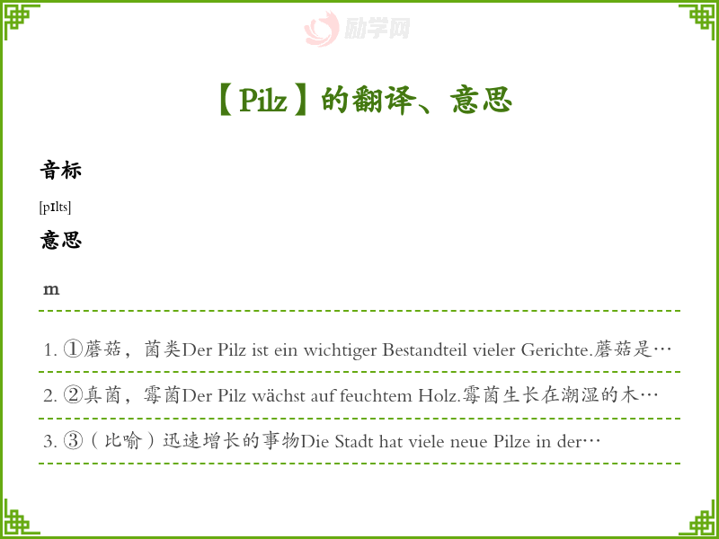 ①蘑菇,菌类Der Pilz ist ein wichtiger Bestandteil vieler Gerichte.蘑菇是许多菜肴的重要成分。