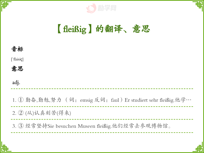 ① 勤奋,勤勉,努力 (词:emsig 反词:faul)Er studiert sehr fleißig.他学习非常用功。Viele fleißige Hände haben daran mitgearbeitet.有很多勤劳人参加了这项工作。