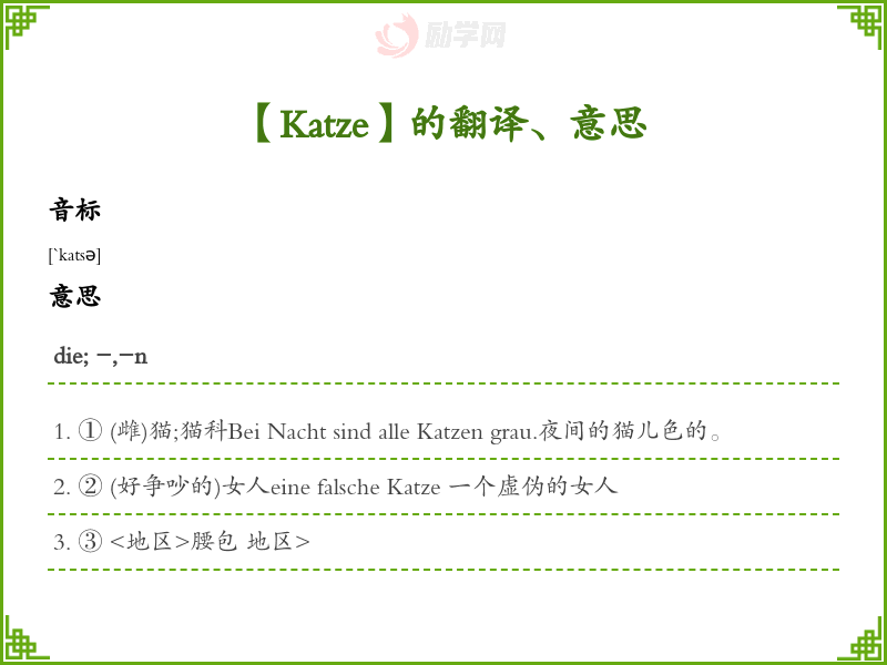 ① (雌)猫;猫科Bei Nacht sind alle Katzen grau.夜间的猫儿色的。