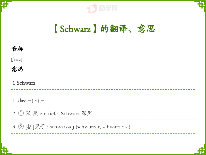 ② (颜)很深,很暗,乌黑,黑油油;黑洞洞,黑漆漆,黑魆魆sich schwarz ärgern常生气,气得脸发紫