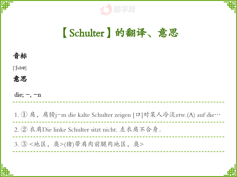 ① 肩,肩膀j-m die kalte Schulter zeigen [口]对某人冷淡etw.(A) auf die leichte Schulter nehmen 小看某事,对某事掉以轻心etw.(A.) auf seine Schultern nehmen 承担某事Schulter an Schulter 肩并肩地,肩挨着肩地