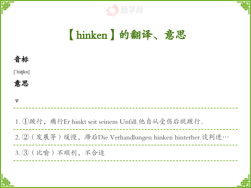 ②(发展等)缓慢,滞后Die Verhandlungen hinken hinterher.谈判进展缓慢。
