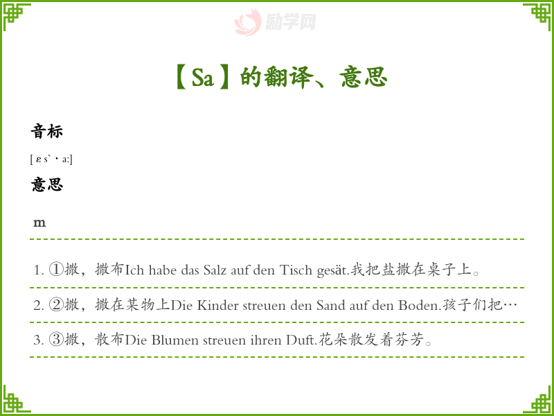 ①撒,撒布Ich habe das Salz auf den Tisch gesät.我把盐撒在桌子上。