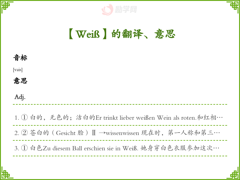 ① 白的,无色的;洁白的Er trinkt lieber weißen Wein als roten.和红相比,他更喜欢喝白。Er ist in den letzten Jahren ganz weiß geworden.最近几年来他的头发全白了。