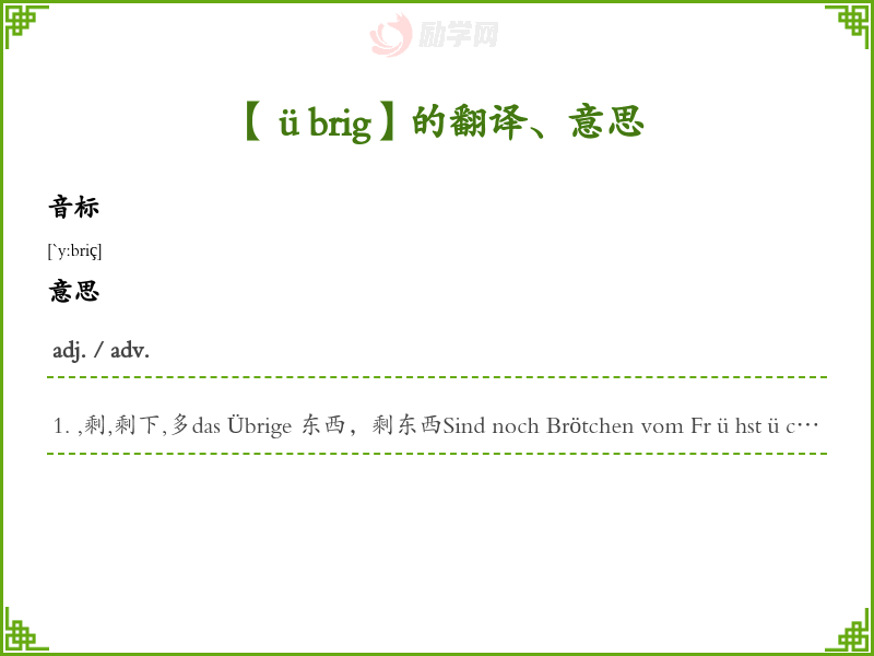 ,剩,剩下,多das Übrige 东西,剩东西Sind noch Brötchen vom Frühstück übrig?早餐小面包还有剩么?Hast du eine Zigarette für mich übrig?你有多烟么,给我一支?Alles Übrige besprechen wir morgen.一切我再商量。Damit wäre der Fall erledigt. Im Übrigen würde ich Sie bitten, mich in Zukunft über so etwas früher zu informieren.这件事就算解决了。顺带提一下,请您今后把这类事早点告诉我。