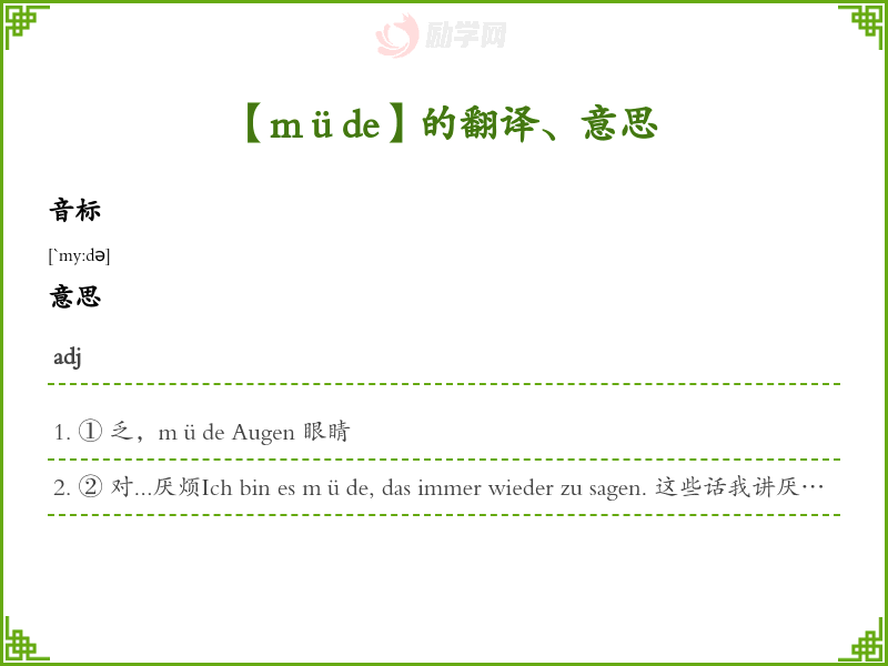 ② 对...厌烦Ich bin es müde, das immer wieder zu sagen. 这些话我讲厌烦。