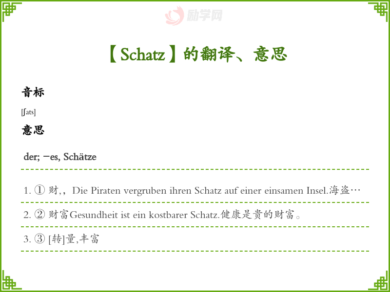 ② 财富Gesundheit ist ein kostbarer Schatz.健康是贵的财富。