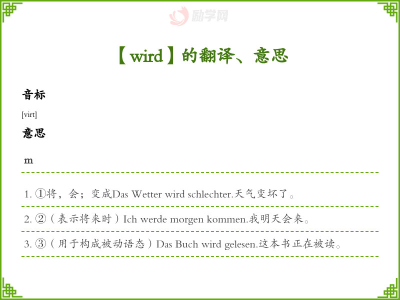 ②(表示将来时)Ich werde morgen kommen.我明天会来。
