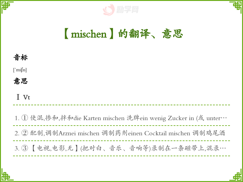 ① 使混,掺和,拌和die Karten mischen 洗牌ein wenig Zucker in (或 unter) den Brei mischen 将少许糖拌到糊里去