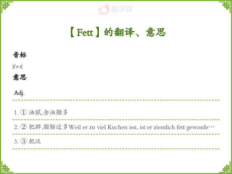 ② 肥胖,脂肪过多Weil er zu viel Kuchen isst, ist er ziemlich fett geworden.他因吃太多糕点,已经变得相当胖了。