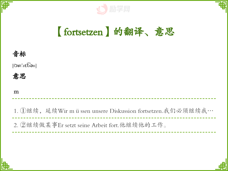 ①继续,延续Wir müssen unsere Diskussion fortsetzen.我们必须继续我们的讨论。