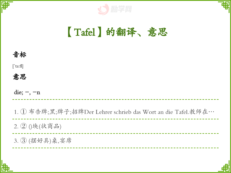 ① 布告牌;黑;牌子;招牌Der Lehrer schrieb das Wort an die Tafel.教师在黑字。