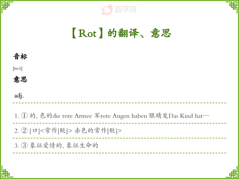 ① 的, 色的die rote Armee 军rote Augen haben 眼睛发Das Kind hat gesunde,rote Backen. 孩子两颊润,显很健康。der rote Faden 主导思想,线das rote Kreuz 十字会vor Zorn rot anlaufen 气了脸