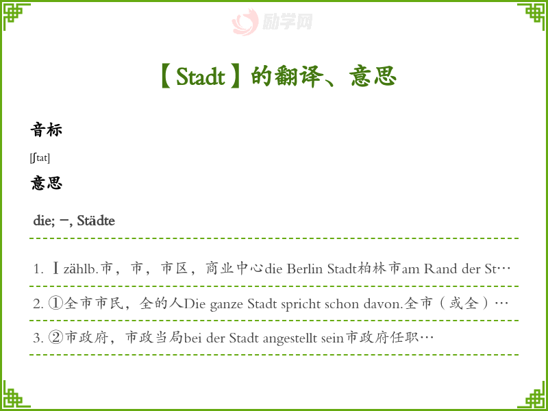 Ⅰzählb.市,市,市区,商业中心die Berlin Stadt柏林市am Rand der Stadt wohnen住市郊Er ist vom Land in die Stadt gezogen.他已从农村迁到市。Ⅱunz.