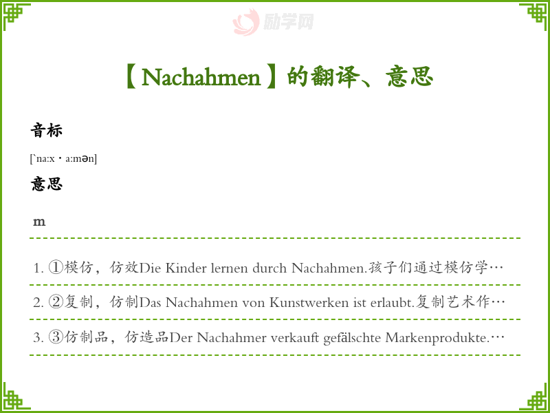 ①模仿,仿效Die Kinder lernen durch Nachahmen.孩子们通过模仿学习。