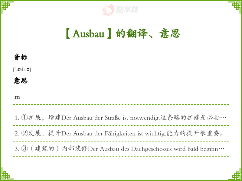 ①扩展,增建Der Ausbau der Straße ist notwendig.这条路的扩建是必要的。