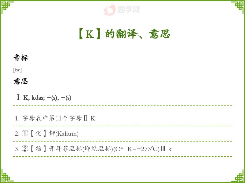 ②【物】开耳芬温标(即绝温标)(O°K=-273℃)Ⅲ k