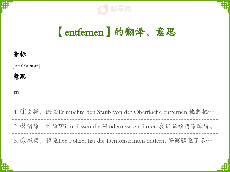 ①去掉,除去Er möchte den Staub von der Oberfläche entfernen.他想把表面的灰尘去掉。