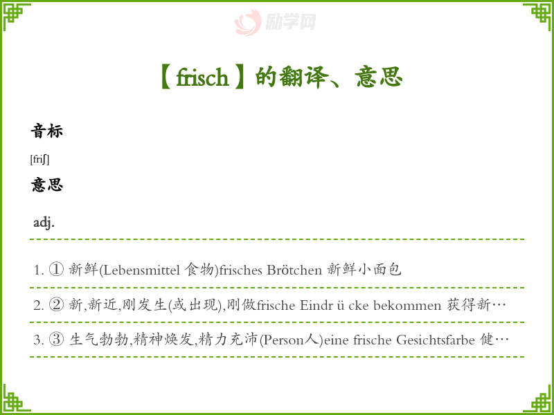 ③ 生气勃勃,精神焕发,精力充沛(Person人)eine frische Gesichtsfarbe 健康面色Wollen Sie sich frisch machen? 您要洗一洗吗?(指洗脸、洗澡等)