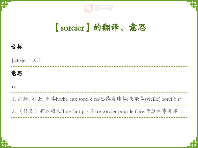 1. 巫师, 术士, 巫婆herbe aux sorcières巴黎露珠草;马鞭草(vieille) sorcière〈转义〉〈口语〉老妖婆 [指丑陋或凶狠老婆子]