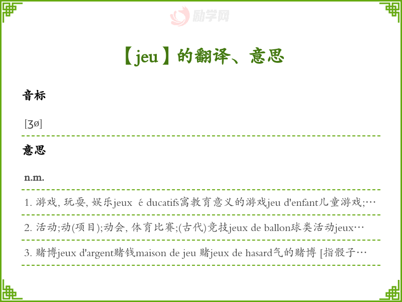 1. 游戏, 玩耍, 娱乐jeux éducatifs寓教育意义的游戏jeu d'enfant儿童游戏;〈转义〉极容易的事, 无足轻重的事Ce n'est qu'un jeu pour lui.这对他来说易如反掌。jeu d'esprit趣味游戏un simple jeu d'esprit〈转义〉诙谐, 玩笑jeu de groupe集体游戏jeux intellectuels智力游戏jeux électroniques电子游戏jeu de mots文字游戏 [如双关、谐音]jeux de main(s)拍打游戏Jeux de mains, jeux de vilains.〈谚语〉打着玩最后总会闹成真打。jeux de société室内游戏 [如猜谜、跳棋等]règle du jeu 游戏规则jeux de prince〈旧语,旧义〉建筑在别人痛苦上的玩乐jeu du destin [de la fortune]命的播弄jeu d'écritures记账par jeu 出于好玩se faire un jeu des difficultés易如反掌地克服困难Je me fais un jeu d'y arriver.我轻而易举就能办到。