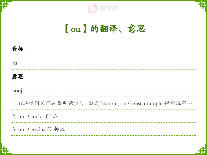 1. 1(连接同义词或说明语)即, 就是Istanbul, ou Constantinople 伊斯坦布尔,即康斯坦丁堡2(数目得近似)un groupe de quatre ou cinq hommes 四五个人的小3(选择, 有时用ou bien 语气)或, 或者oui ou non 是或否Il lui est parfaitement égal d'être ici ou là. 对他来说,在这里还是在那里,完全一样Il faut qu'une porte soit ouverte ou fermée. 二者必居其一。4(重复使用, 在选择时二者必居其一)不是…就是…, 或者…或者…Ou j'irai, ou vous viendrez. 不是我去,就是您来。5(在祈使句后面引出后果从句)否则, 要不然Dépêche-toi, ou tu manqueras le train. 赶快,否则你就要赶不上火车了。n.m.【逻辑学】