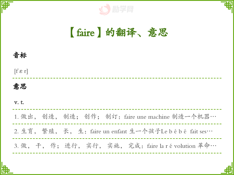 1. 做出, 创造, 制造; 创作; 制订:faire une machine 制造一个机器faire le pain 做面包L'abeille fait du miel. 蜂酿。 L'oiseau fait son nid. 巢。 faire une loi 制订一项法律faire une société sans exploitation de l'homme par l'homme 建立一个没有人剥削的社会