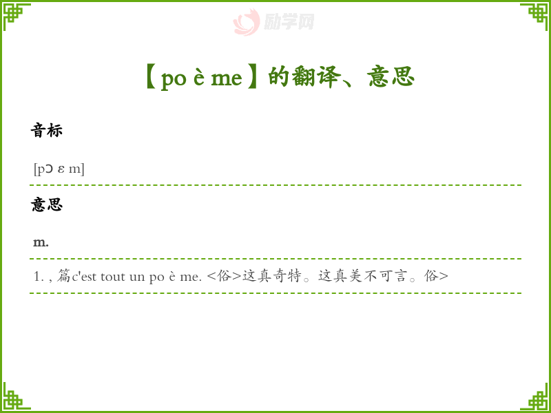1. , 篇c'est tout un poème. <俗>这真奇特。这真美不可言。俗>