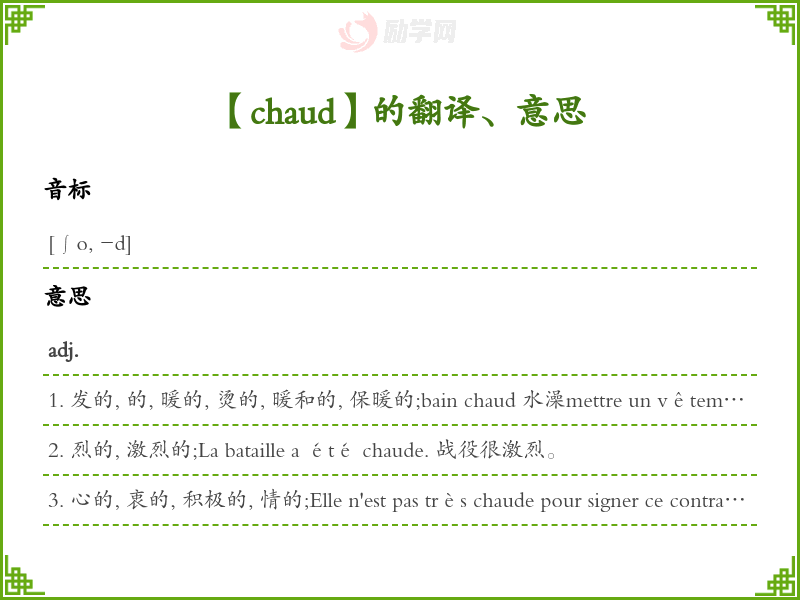 1. ; 的感觉Elle endure mieux le chaud que le froid.她比较耐而怕冷。常见用法la semaine sera chaude en raison des grèves因为有罢工,这一周会很闹le match était chaud这场比赛很激烈plat chaud qui fume冒着气的菜il fait trop chaud, ce n'est pas tenable天气了,真是受不了il faut battre le fer quand il est chaudde fer钢铁般的avoir chaud感到manger chaud趁吃il fait chaud天气ce manteau me tient chaud这件大衣使我暖和rester bien au chaud待在暖和的地方je garde la viande au chaud en attendant qu'il arrive我温着肉等他回来