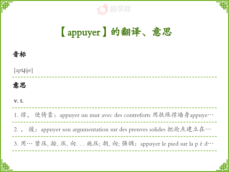1. 撑, 使倚靠:appuyer un mur avec des contreforts 用扶垛撑墙身appuyer une échelle contre un mur 把梯子靠在墙上appuyer sa tête sur un fauteuil 把头靠在椅背上appuyer ses coudes sur la table 把胳膊肘撑在桌子上