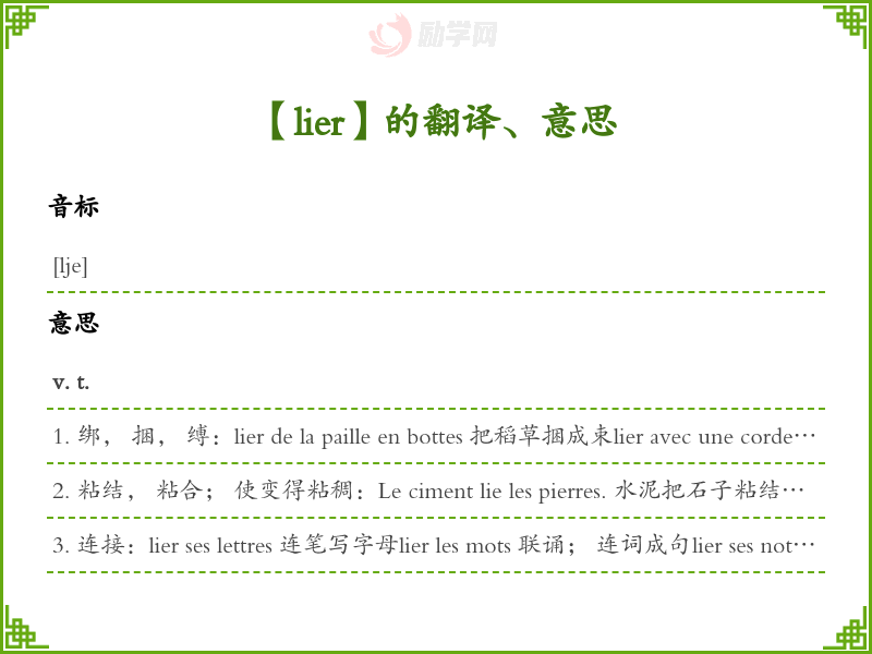 3. 连接:lier ses lettres 连笔写字母lier les mots 联诵; 连词成句lier ses notes [乐]圆滑地演奏或演唱lier les pensées 使思想联贯起来