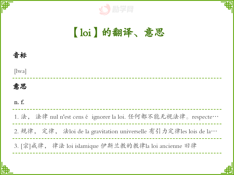1. 法, 法律 nul n'est censé ignorer la loi. 任何都不能无视法律。respecter la loi 遵守法律transgresser la loi 违犯法律
