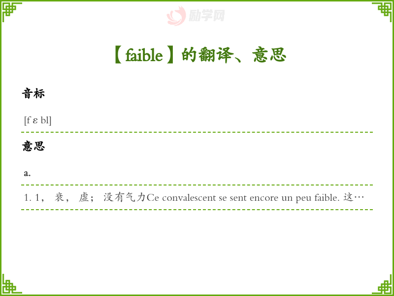 1. 1, 衰, 虚; 没有气力Ce convalescent se sent encore un peu faible. 这位正在康复病人仍然觉得有些虚。2脆, 固, 结实, 牢s'appuyer sur une voûte faible 靠在一个结实拱门上3小, 力量单薄, 无能为力4<旧>智力差5成绩差6差[指文艺作品等]; 无说服力, 无力[指论据等]7懦, 软, 脆, 意志薄; 容 Les gens faibles sont à la merci d'autrui. 软人听凭他人支配。8微, 微小; 少量; 稀薄Une petite lampe électrique donnait une faible lumière. 一盏小小电灯发出微光。9 le côté[le point, la partie]~点; 缺点旧>n. m1者[用pl. 或作为集合名词]2懦人, 软人3<旧>(事物)薄之处, 固地方; <引>缺陷, 短处4<书>(人)点, 缺点; 偏爱, 嗜好书>引>旧>