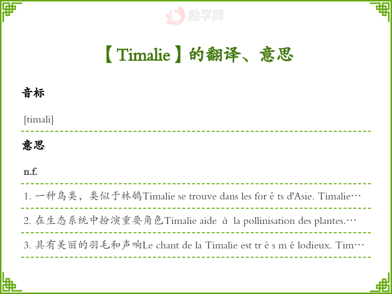 1. 一种鸟类,类似于林鸲Timalie se trouve dans les forêts d'Asie. Timalie在亚洲森林中发现。