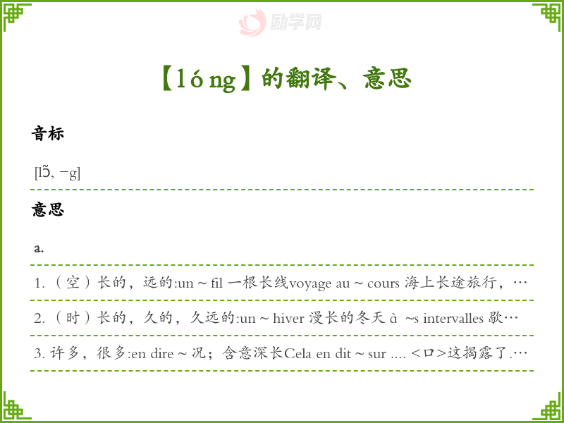 2. (时)长的,久的,久远的:un ~ hiver 漫长的冬天à ~s intervalles 歇时长地,相隔很久地~ de (时)长为...,...之久~ (à)缓慢的,迟缓的;时的faire ~ feu 因发火过慢而没有命中;<转>失败,告吹转>n. m 长, 长度adv.