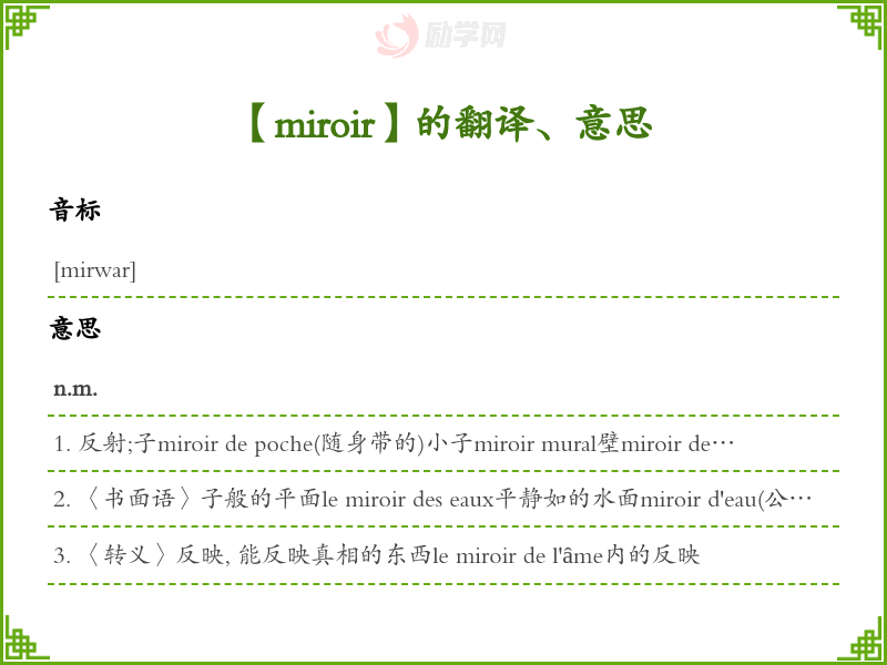 1. 反射;子miroir de poche(随身带的)小子miroir mural壁miroir de courtoisie(装在汽车内的)化se regarder dans un miroir 子miroir plan [concave, convexe]平面 [凹, 凸]miroir déformant [grossissant]哈哈miroir sphérique [parabolique]球面 [抛物面]miroir magnétique【物理学】磁, 磁塞miroir ardent聚光miroir laryngien【医学】喉miroir aux alouettes诱鸟反光;〈转义〉骗人的东西, 迷惑人的东西