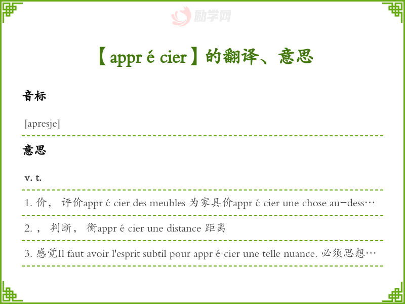【apprécier】 助记: 词根: 派生: 联想: 名词变化: 近义词: 反义词: 联想词