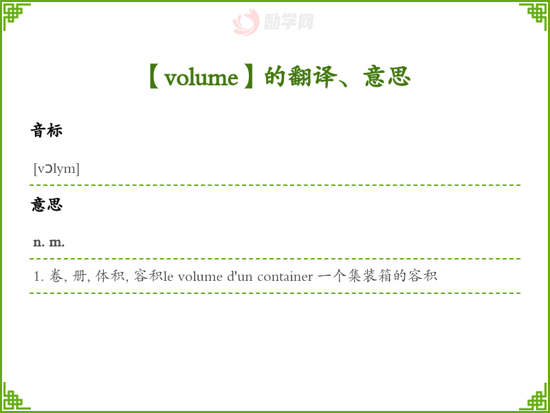 1. 卷, 册, 体积, 容积le volume d'un container 一个集装箱的容积