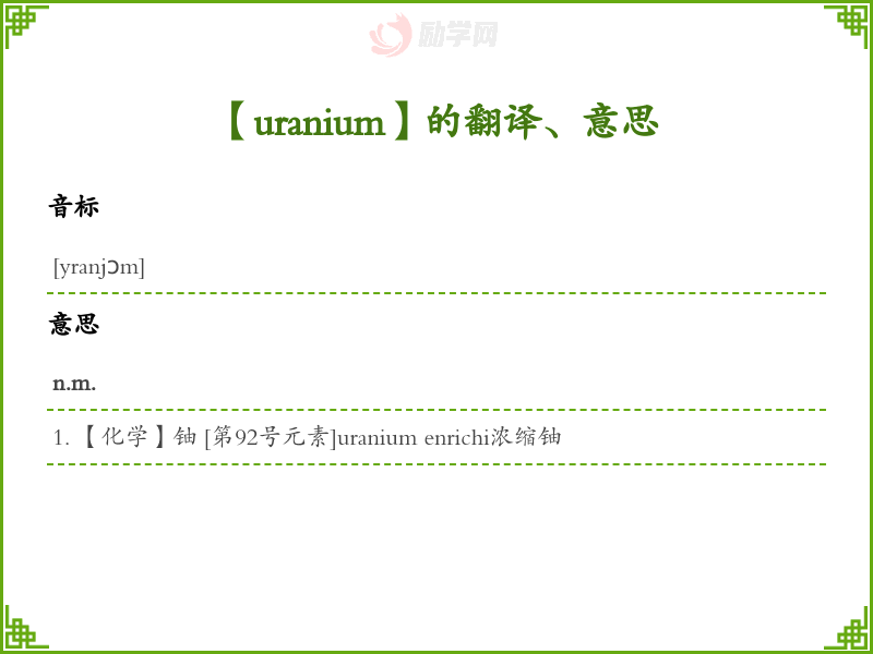 1. 【化学】铀 [第92号元素]uranium enrichi浓缩铀