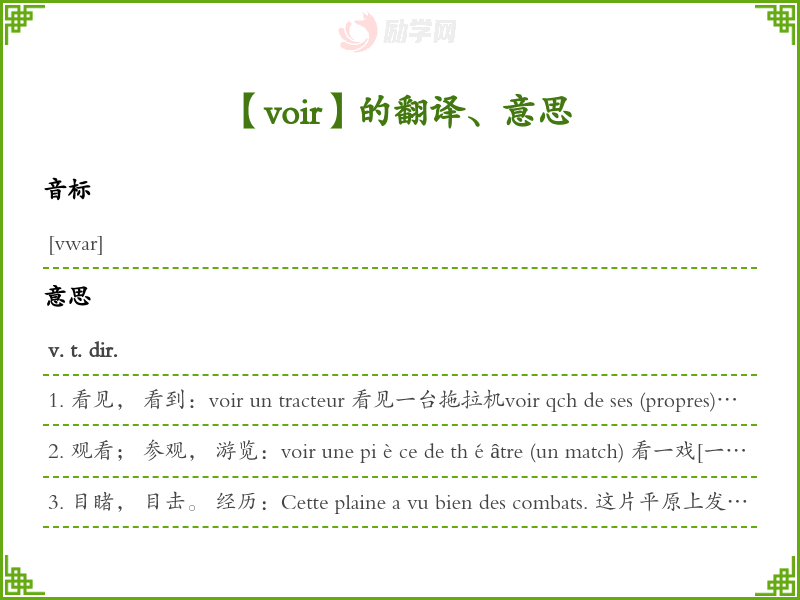 1. 看, 看见:ne plus voir 失明, 眼瞎了voir trouble 眼花, 看不清楚voir clair 看得一清二楚voir double (酒醉眼花时)把一物看成叠影On ne voit pas à dix pas. 十步外就看不见了。 regarder sans voir 视而不见voir de loin (bien loin) [转]有远见, 看得远ne voir que par les yeux d'autrui 人云亦云voir avec les yeux de la foi 盲目相信, 迷信