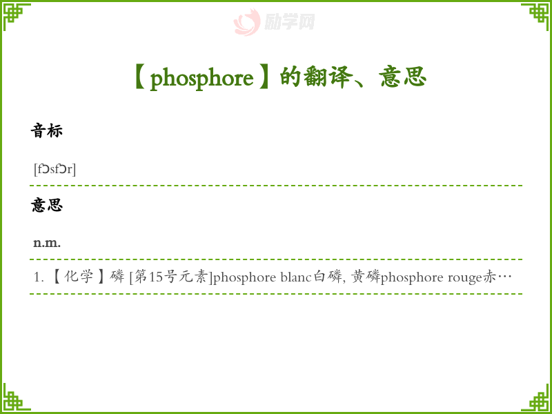 1. 【化学】磷 [第15号元素]phosphore blanc白磷, 黄磷phosphore rouge赤磷, 红磷bombes au phosphore 含磷(燃烧)弹des yeux de phosphore 〈比喻〉闪闪发的眼睛