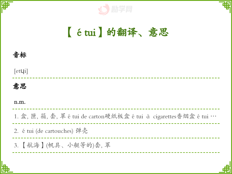 1. 盒, 匣, 箱, 套, 罩étui de carton硬纸板盒étui à cigarettes香烟盒étui à dissection解剖器械盒étui à lunettes眼镜盒étui de mathématiques制图仪器盒étui de parapluie雨伞套étui à revolver手枪套