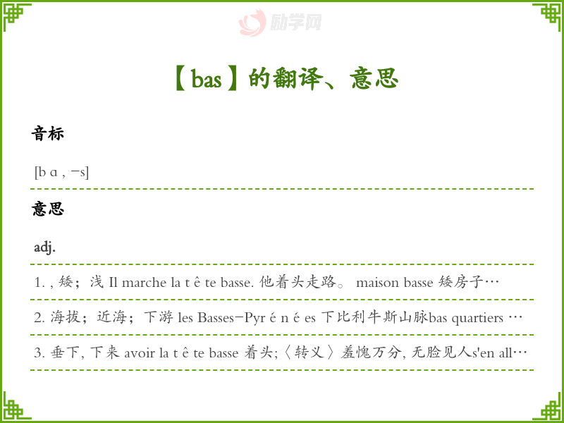 1. , 矮;浅 Il marche la tête basse. 他着头走路。 maison basse 矮房子appartement bas de plafond 房顶套房être bas sur pattes 腿短, 脚矮la marée basse 退潮;潮Les eaux sont basses. 水位了。La température est basse. 温度。Le fleuve est bas. 河水浅。
