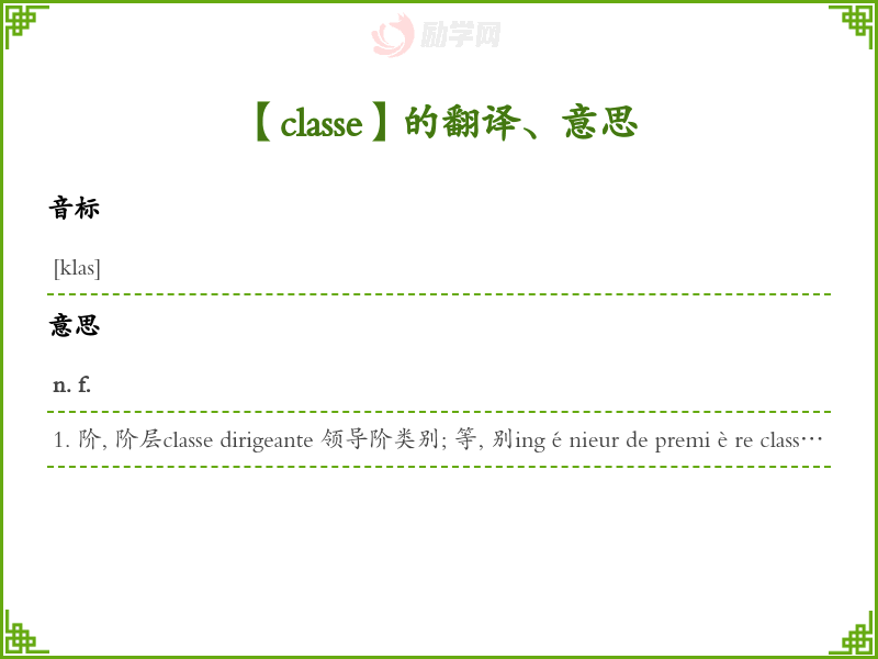 1. 阶, 阶层classe dirigeante 领导阶类别; 等, 别ingénieur de première classe 一工程师(动植物分类中的)纲(中小学的); , , 同学; 课, 课程; 教室classe d'histoire 历史课suivre la classe 上课,听课<集>同达到服兵役龄的青应届退役者pl. 军事训练类出色, 高雅, 高档次, 高水平集>