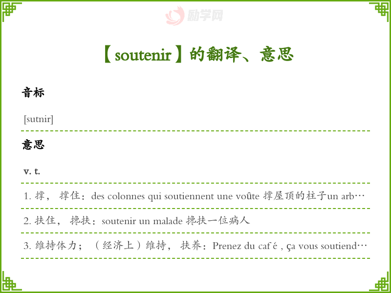 1. 撑, 撑住:des colonnes qui soutiennent une voûte 撑屋顶的柱子un arbre soutenu par un tuteur 一棵用柱撑住的树soutenir son menton dans ses mains 两手撑住下巴Aidez-moi à soutenir ce tableau pour l'accrocher au mur. 帮我托住这幅要挂在墙上的画。