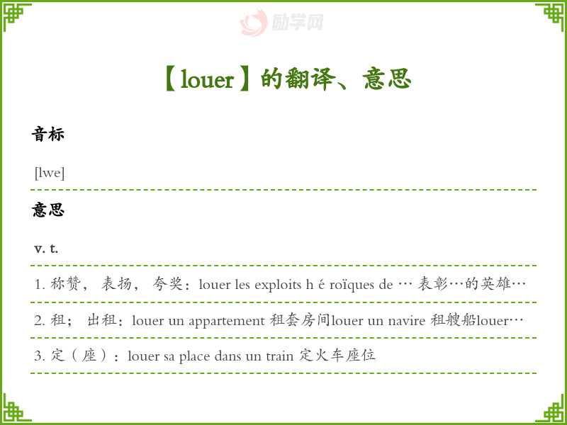 1. 称赞, 表扬, 夸奖:louer les exploits héroïques de … 表彰…的英雄事迹louer les qualités d'une chose 称赞样东西的优点louer qn de (pour) qch 由于某事赞扬某人:on loua l'orateur pour la clarté de son exposé. 大家称赞演说者讲得清楚。 Dieu soit loué! 谢天谢地!