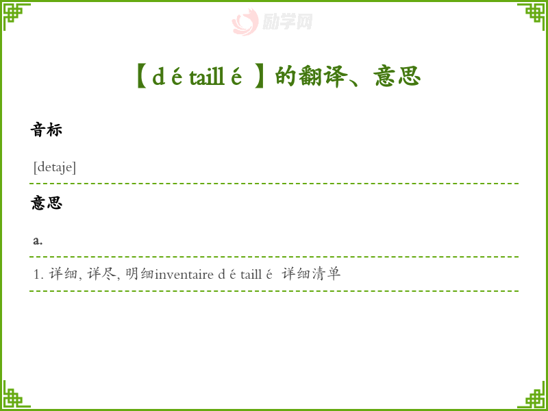 1. 详细, 详尽, 明细inventaire détaillé 详细清单
