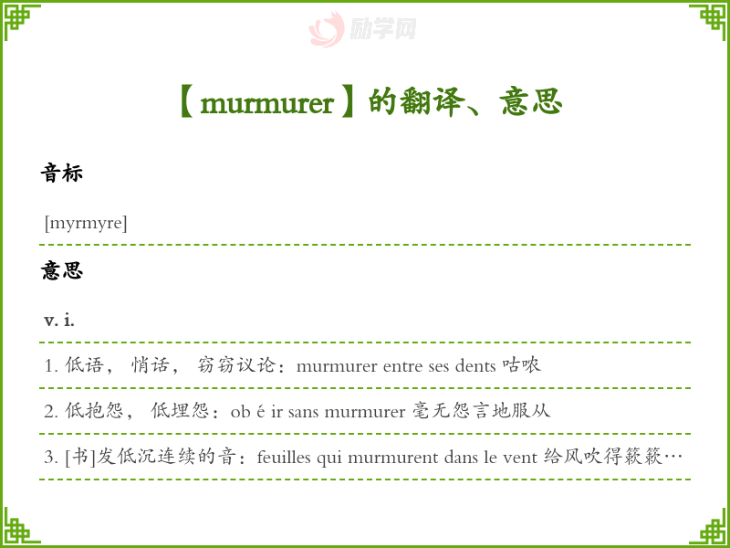 4. 低, 悄悄地:On murmure que… 有消息在悄悄流传…murmurer un secret dans l'oreille de qn 凑在某耳边悄悄一桩秘密